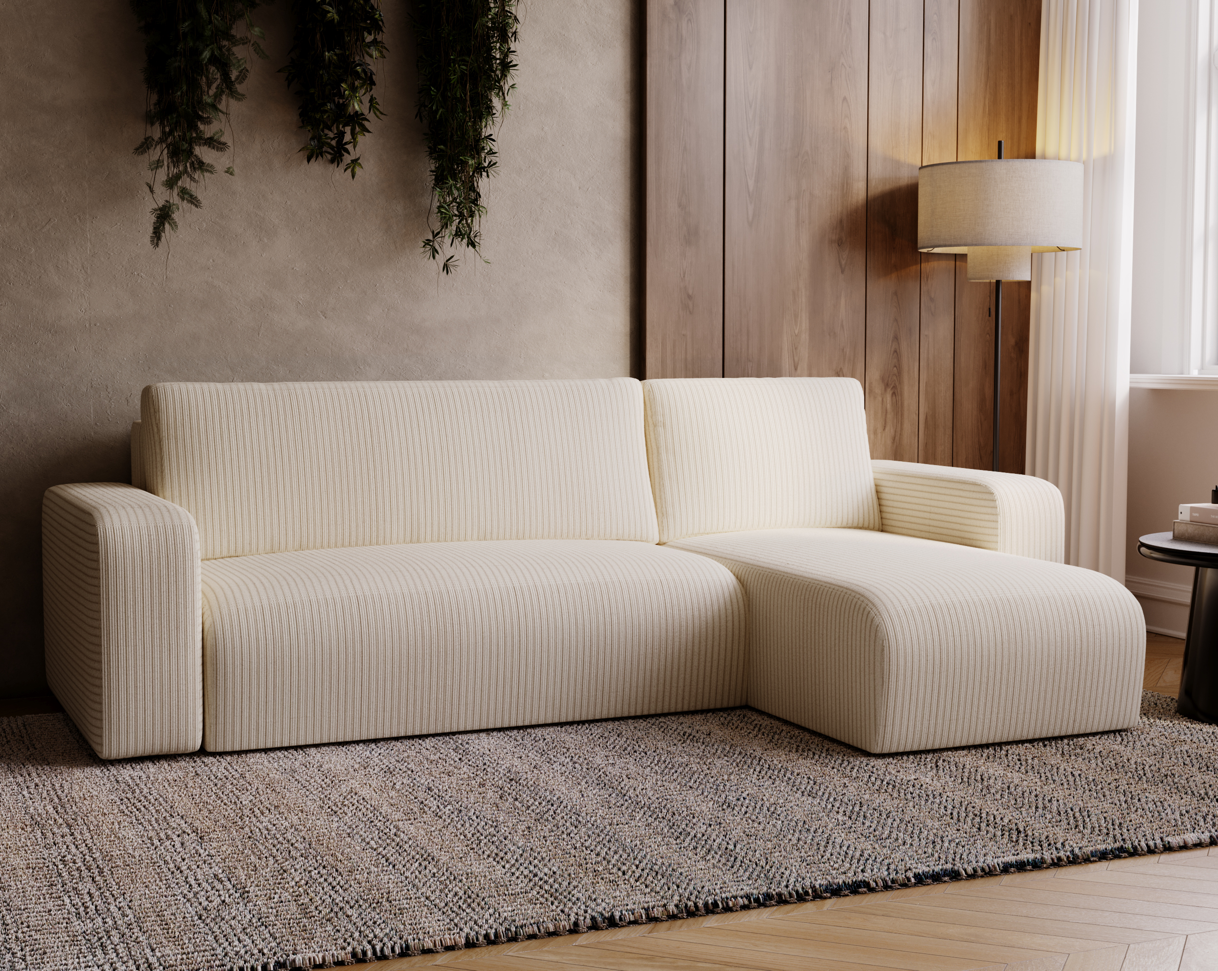 - Tkanina sztruksowa ANAFI – grube, wyraziste prążki nadają meblowi charakteru, a jednocześnie są miękkie i trwałe.