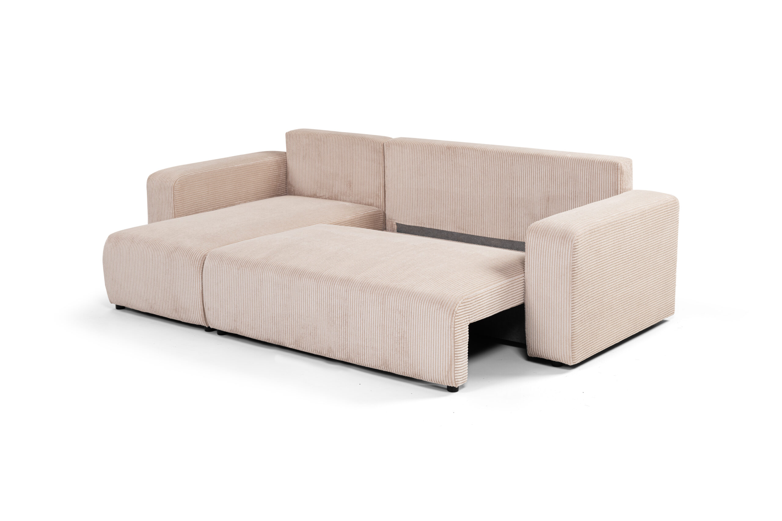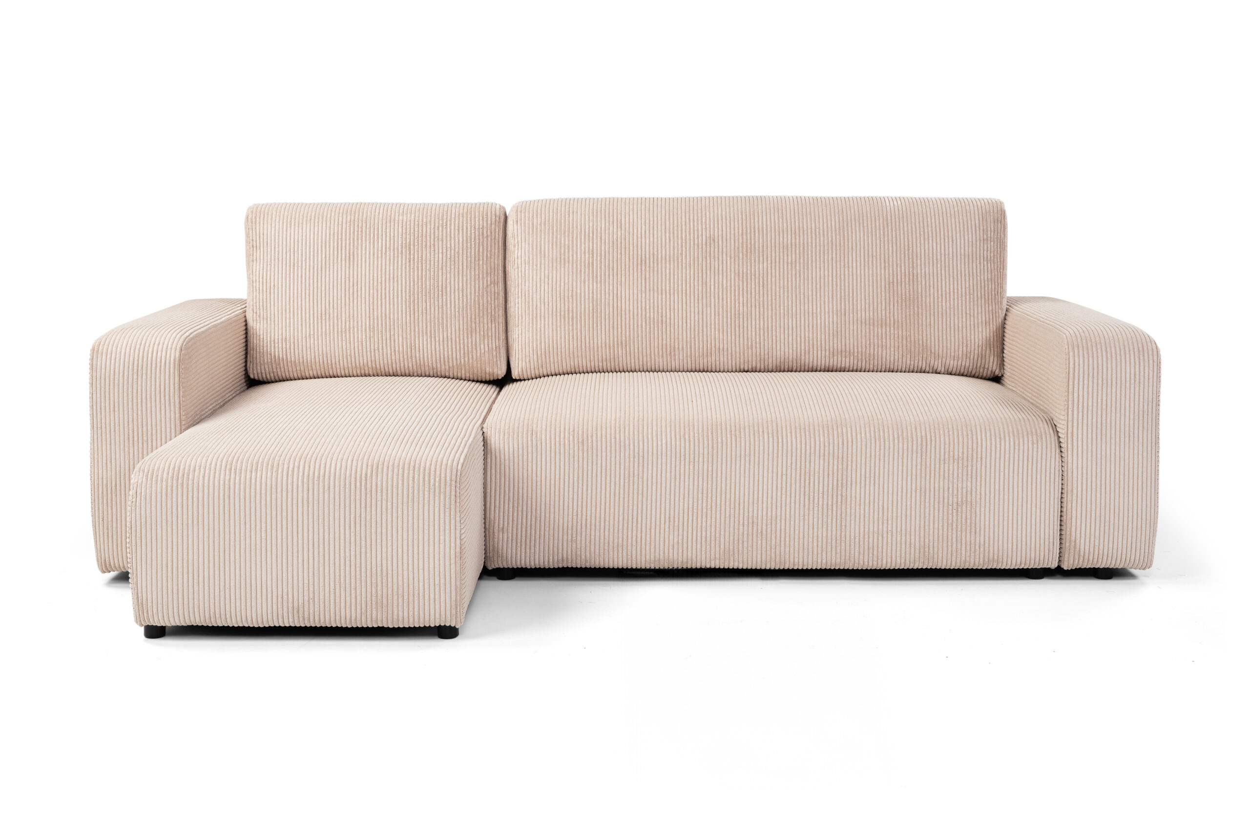 Narożnik sztruksowy GOYA (245 × 150 cm) – uniwersalny, funkcja spania, pojemnik na pościel